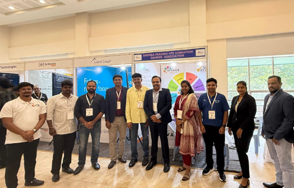 Acting as the association partner of the summit, the Andhra Pradesh VFX, Animation & Gaming Association (APVAGA) represented the Animation, VFX, Gaming & XR (AVGC-XR) sector with energy and purpose. The APVAGA stall showcased immersive AR and VR experiences, attracting visitors from industry leaders and educational institutions alike. The delegation from APVAGA—including Sreedhar Kosaraju (Chairman of APDTI Network, Founder & MD of Nimaisoft Systems), Rudra Balaji (President of APVAGA and Virtual Production Supervisor at Ramoji Film City), Sridhar Reddy (Founder & CEO of JustVFX Studios and Vice President of APVAGA), Meghana Tirumalasetty (Co-Founder of Little Black Star VFX and Joint Secretary of APVAGA), Sasidhar Paka (Founder & CEO, Staple IT), Anil Kumar (COO & Business Head, War FX), Kanakaraju (CG Supervisor – VFX), Siril and Jay—engaged in high-level networking, attended sessions on technology and policy, and strengthened Andhra Pradesh’s presence in the national creative-tech ecosystem.